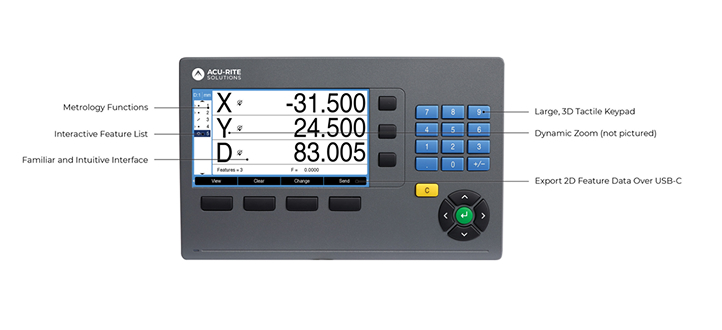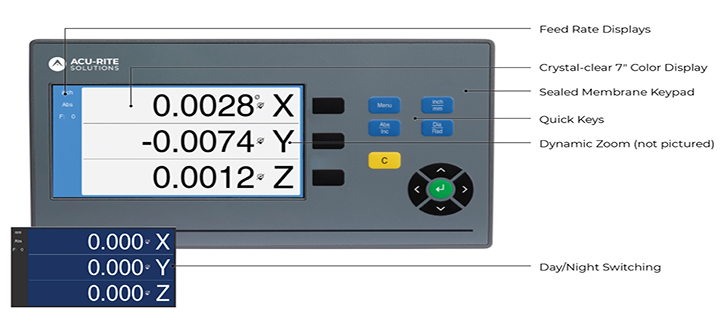 The Acu-Rite Solutions DRO203Q is a 2D geometric readout optimized for optical comparators and measuring microscopes. Powered by Quadra-Chek and backed by the continuous innovation of HEIDENHAIN, the DRO203Q measures 2D features with greater accuracy and efficiency. The DRO203Q has basic pre-programmed common cycles and metrology-specific functions for six different feature types. It provides extremely precise measurements, creating higher-quality workpieces, less scrap, and tighter tolerances.