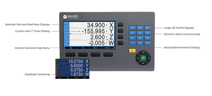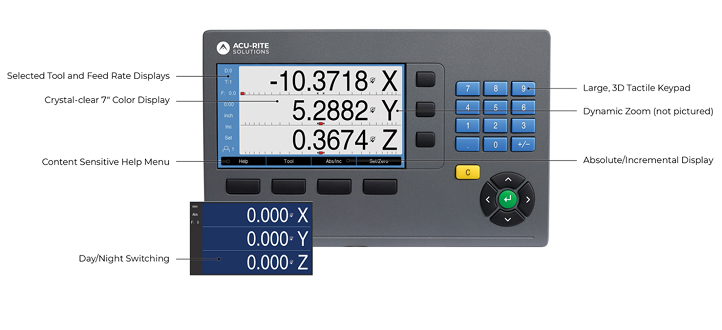 Grow machine tool profitability with the most popular DRO. The Acu-Rite Solutions DRO300 is the most complete digital readout on the market. Backed by the continuous innovation of HEIDENHAIN, it improves the accuracy and efficiency of manual machine tools with up to four axes. Choose the IB2X option to allow up to six axes for large machine tool applications. The DRO300 continuously displays the true location of all axes through pre-programmed common cycles and milling and turning-specific functions. This creates higher-quality machined workpieces, less scrap, and tighter tolerances.
