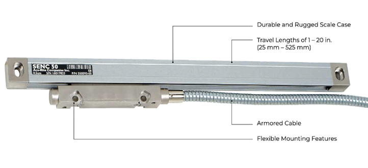 The SENC 50 is a compact linear encoder providing high-accuracy feedback in limited and restricted spaces. The precision glass scale resists size, shape, and density changes regardless of temperature and humidity variations, thanks to advanced optical technology developed by HEIDENHAIN. Better accuracy improves machining quality and time and cost savings. The SENC 50 features multiple resolutions with superior accuracy as well as Position-TracTM, which quickly recalls absolute zero (datum) after power loss.