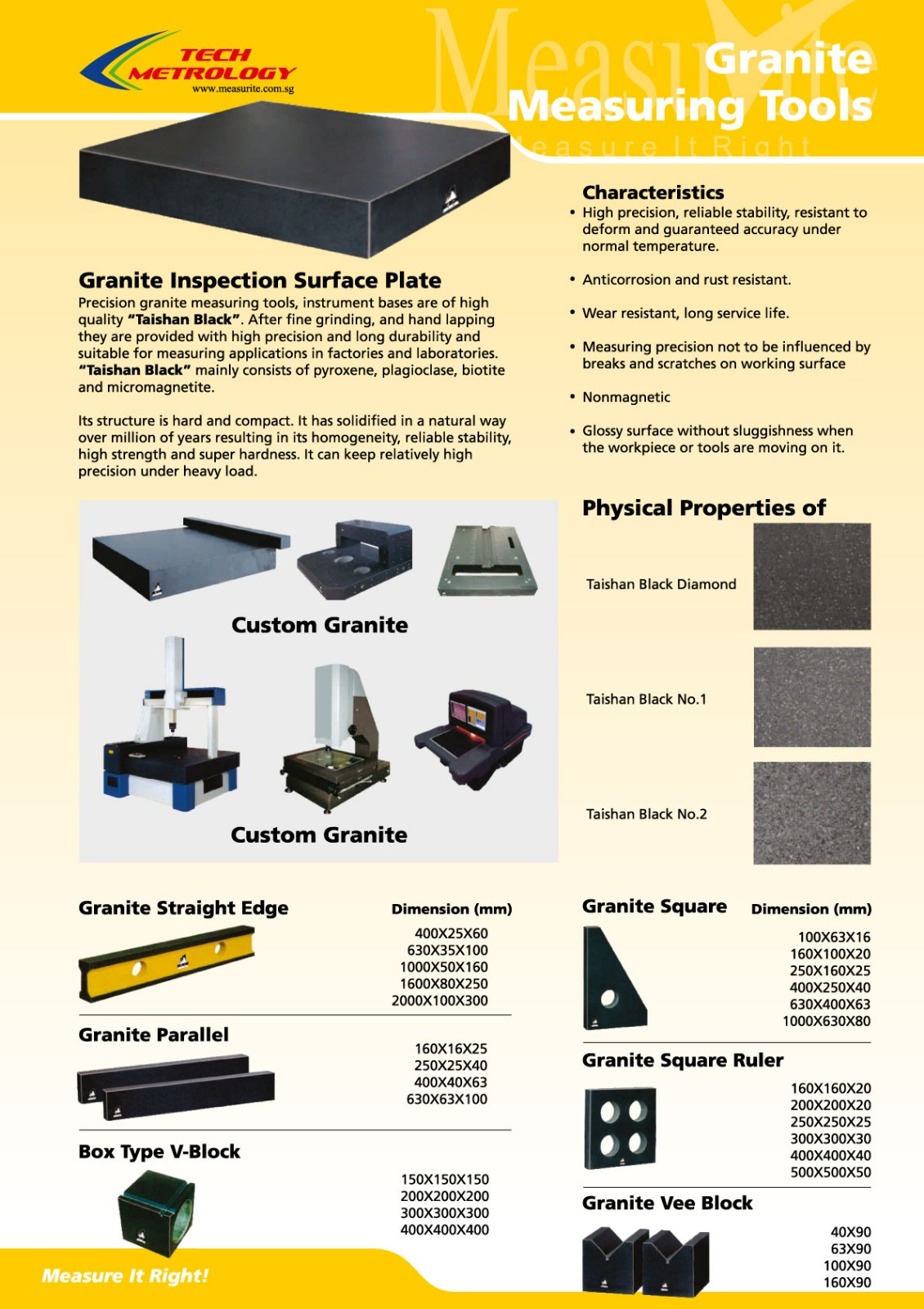 Precision granite measuring tools, instrument bases are made of high quality “Taishan Black After fine grinding and hand lapping they are provided with high precision and long durability and suitable for measuring applications in factories and laboratories. “Taishan Black” mainly consists of pyroxene, plagioclase, biotite and micromagnitudes structure is hard and compact. It has solidified in a natural way over millions of years resulting in its homogeneity, reliable stability, high strength and super hardness. It can keep relatively high precision under heavy load.